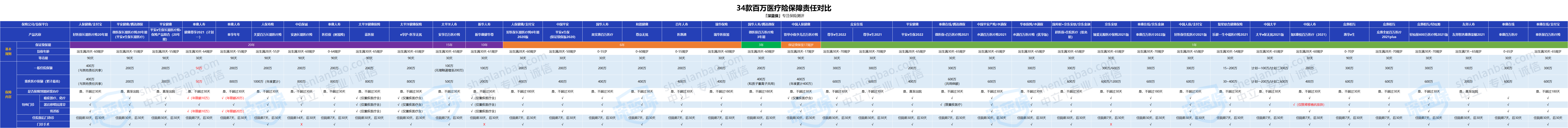 我们搜集整理了市面上34款百万医疗险,对保障责任进行了对比: