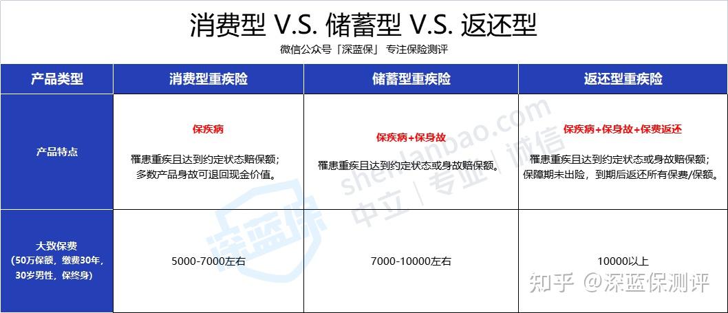 而除了上述三种分类方式以外,其实还有一种分类方式是大家比较关注的,那就是根据重疾险产品的性质可分为三个类型:消费型重疾险、储蓄型重疾险和返还型重疾险。
