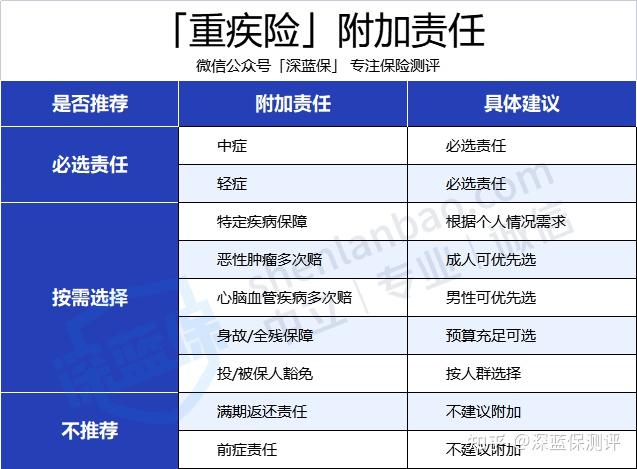 主流的重疾险,一般涵盖3项基本责任,外加一些可选责任或其他保障: