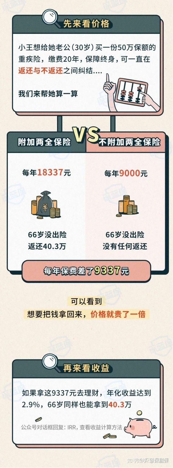 返还型重疾险这类“重疾险+两全保险”的组合产品真的很划算吗?我们可以看看下面这个例子: