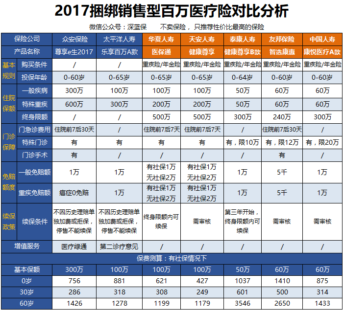 直接说结论:这些捆绑销售的产品中续保条件最好的是华夏医保通,泰康健康尊享B次之。我们具体来看一下各个产品差异: