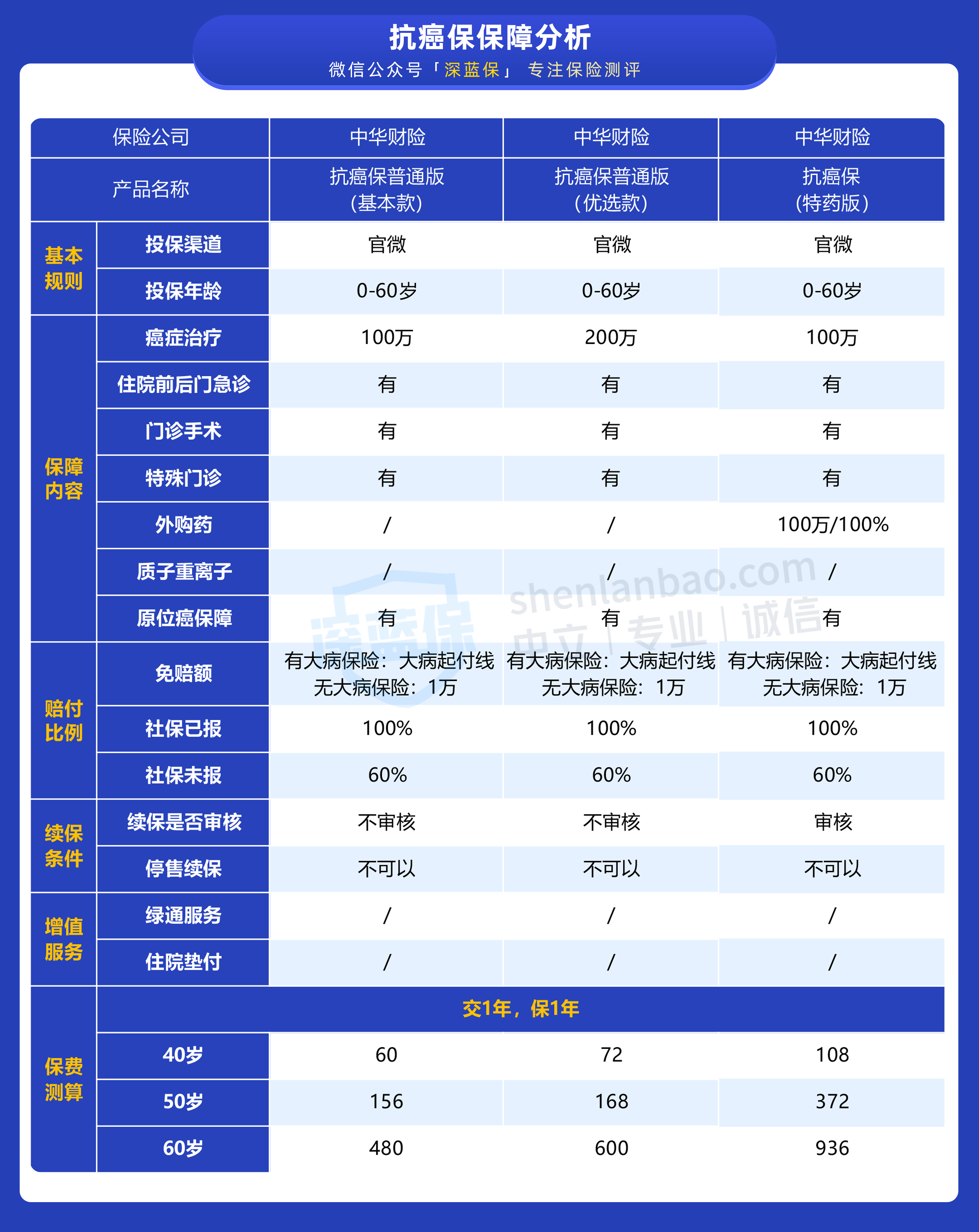 癌症作为最高发的疾病,风险能堵住一个算一个,抗癌保一共有 3 种版本: