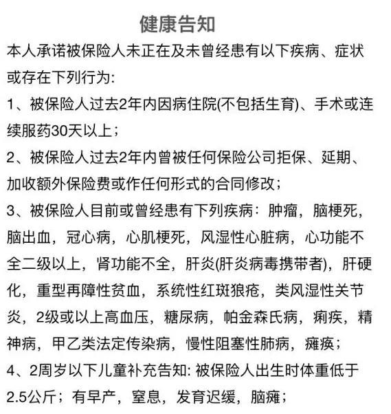 - 健康告知宽松:这款产品的健康告知也非常宽松,只要2年内没住过院,非早产儿童,符合健康告知都是可以购买的。相对其他重疾险,这样的健康告知算非常宽松的了。深蓝君也特意把健康告知截图如下: